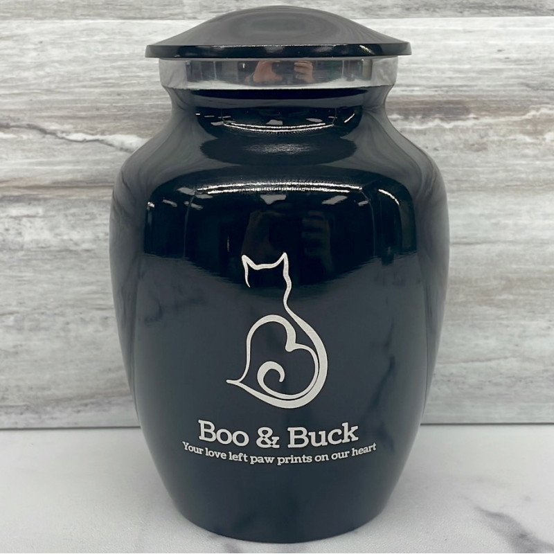 The Small Jet Black Cat Silhouette Sharing Urn Pet Cremation Urn is an attractive and meaningful way to pay tribute to your pet who has passed on. Optional engraving features a name line and two additional lines that can include dates or sentiment lines. Choose from our most popular sentiments, customize them or enter your own text to make it completely unique.