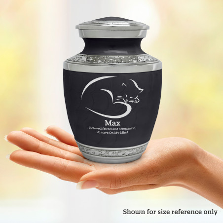 The Small Cat Sleep II Pet Cremation Urn - Ebony Black is an attractive and meaningful way to pay tribute to your pet who has passed on. Optional engraving features a name line and two additional lines that can include dates or sentiment lines. Choose from our most popular sentiments, customize them or enter your own text to make it completely unique.