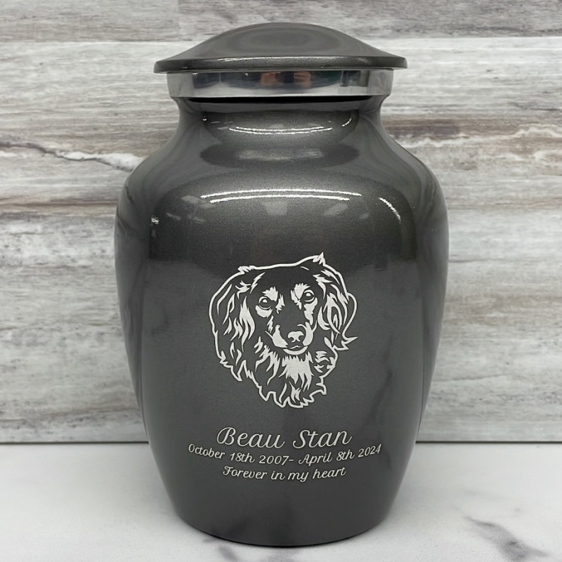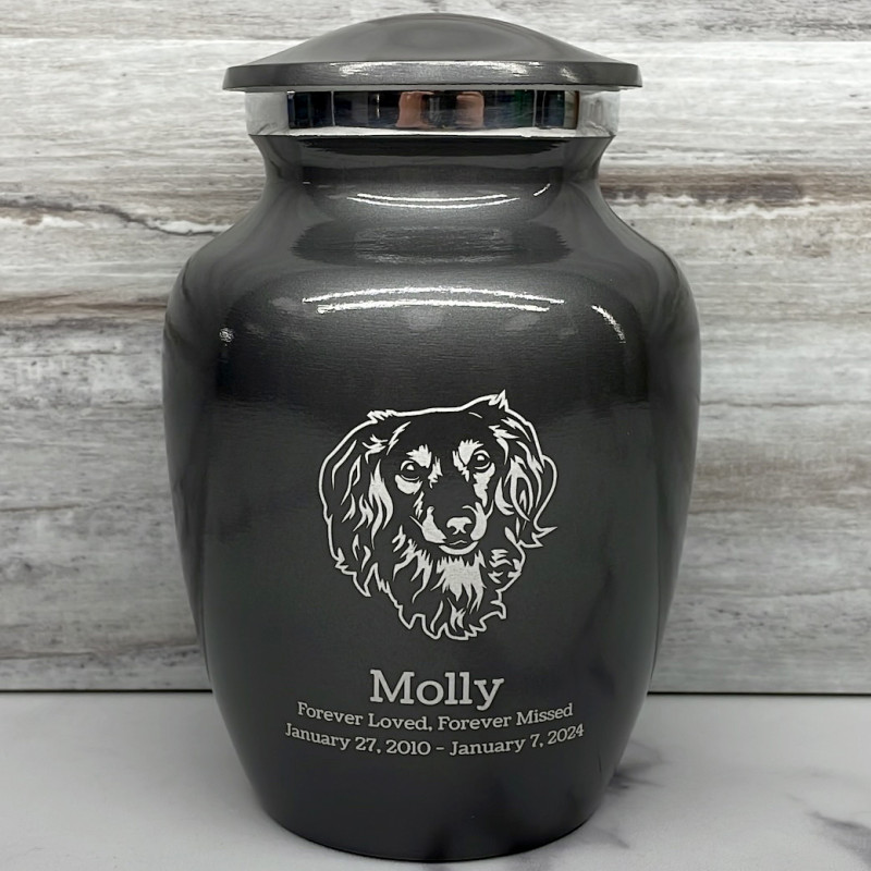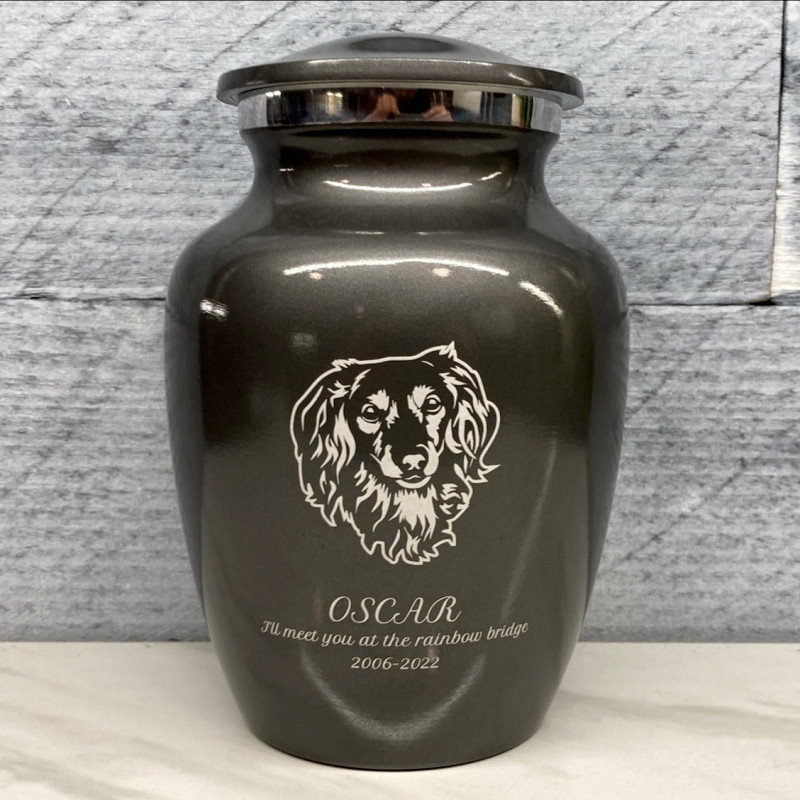 The Small Gunmetal Gray Daschund Dog Cremation Urn is an attractive and meaningful way to pay tribute to your pet who has passed on. Optional engraving features a name line and two additional lines that can include dates or sentiment lines. Choose from our most popular sentiments, customize them or enter your own text to make it completely unique.