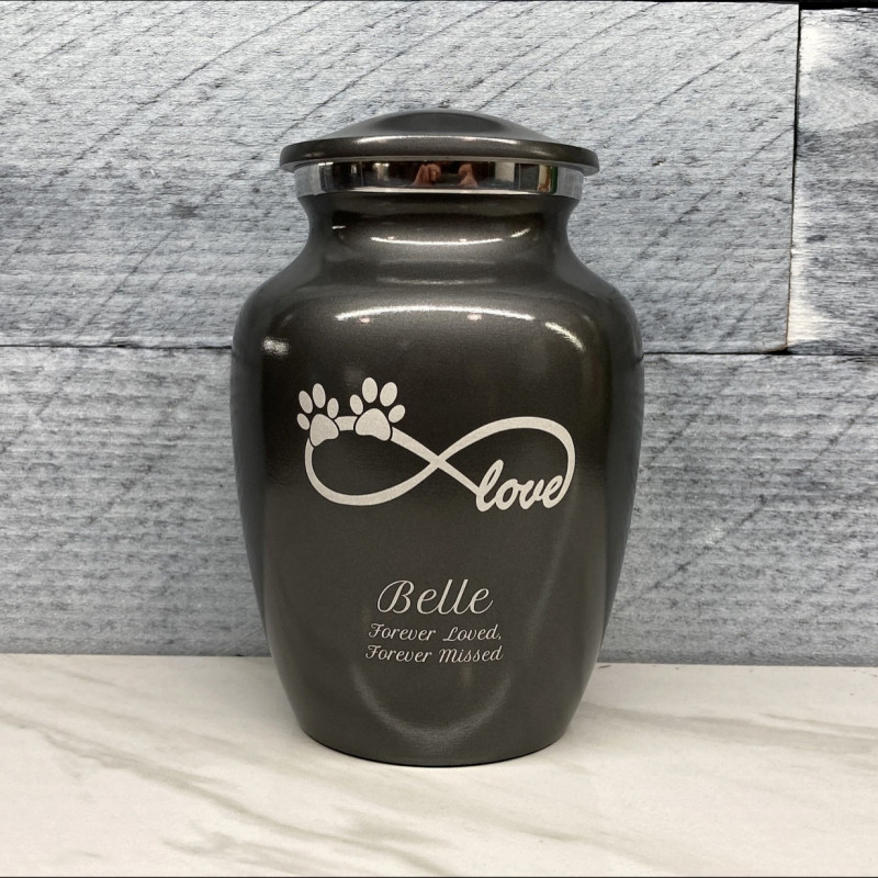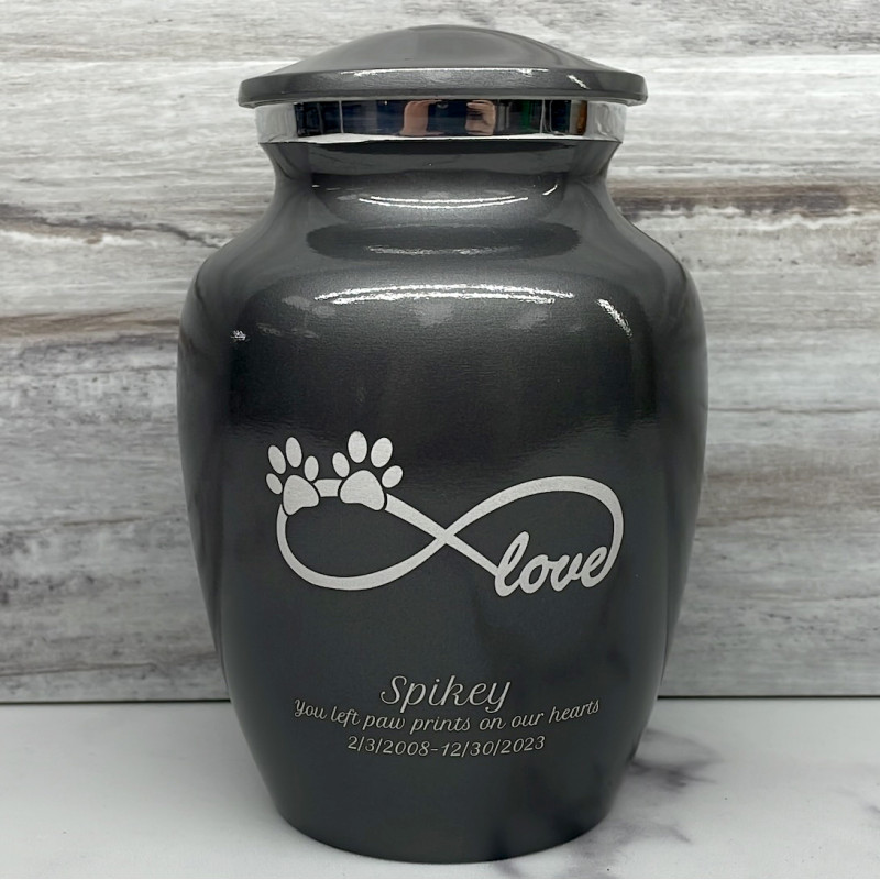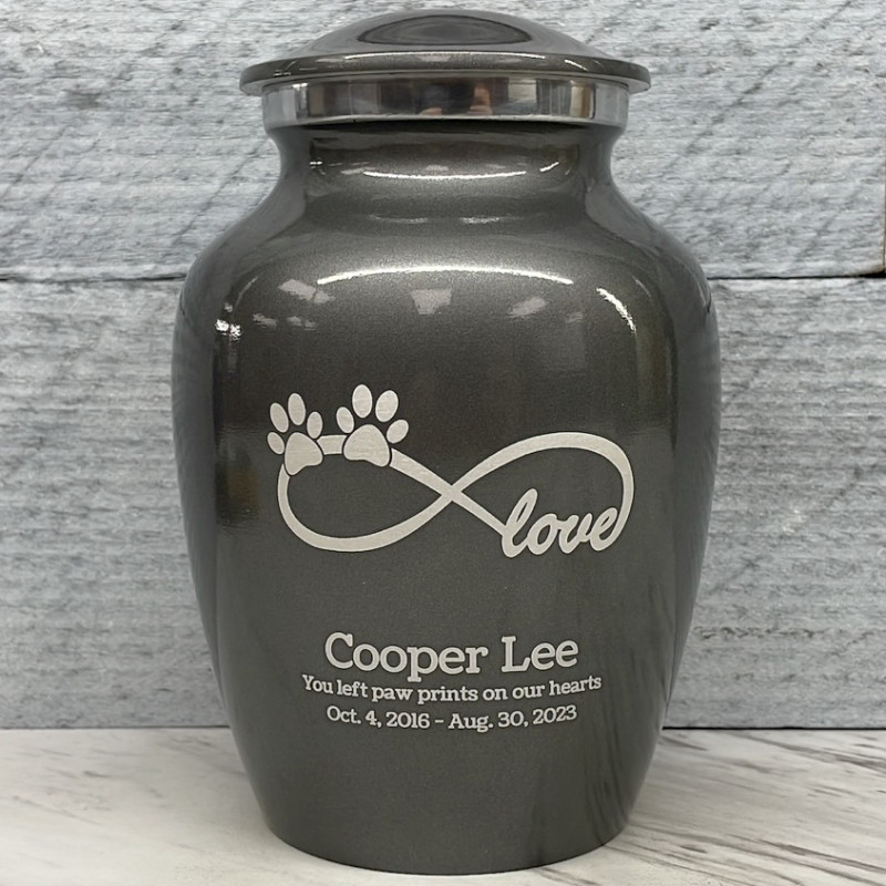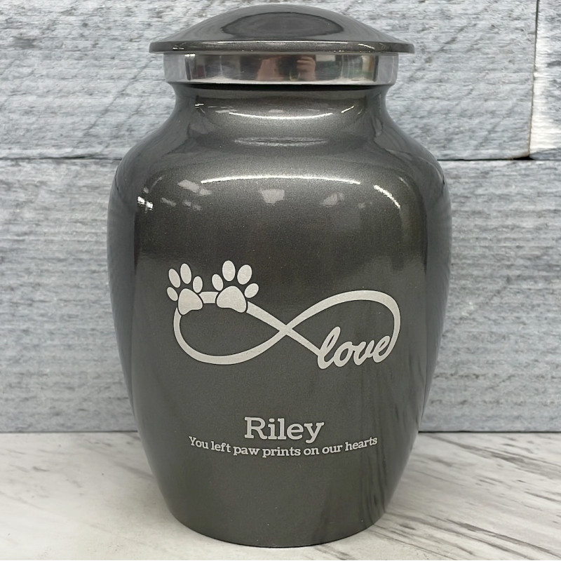 The Small Gunmetal Gray Infinite Love Pet Cremation Urn is an attractive and meaningful way to pay tribute to your pet who has passed on. Optional engraving features a name line and two additional lines that can include dates or sentiment lines. Choose from our most popular sentiments, customize them or enter your own text to make it completely unique.