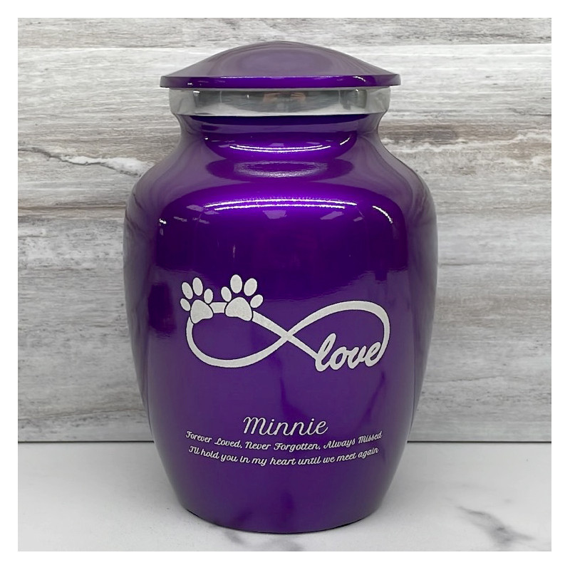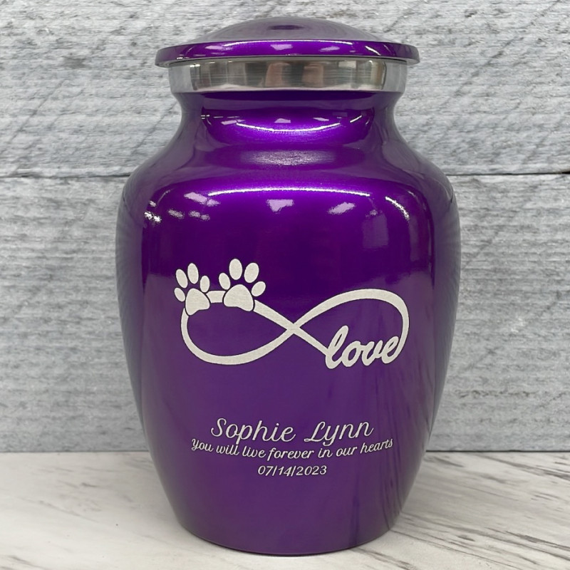 The Small Purple Luster Infinite Love Pet Cremation Urn is an attractive and meaningful way to pay tribute to your pet who has passed on. Optional engraving features a name line and two additional lines that can include dates or sentiment lines. Choose from our most popular sentiments, customize them or enter your own text to make it completely unique.