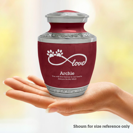 The Small Infinity Love Paw Prints Pet Cremation Urn - Rose Red is an attractive and meaningful way to pay tribute to your pet who has passed on. Optional engraving features a name line and two additional lines that can include dates or sentiment lines. Choose from our most popular sentiments, customize them or enter your own text to make it completely unique.