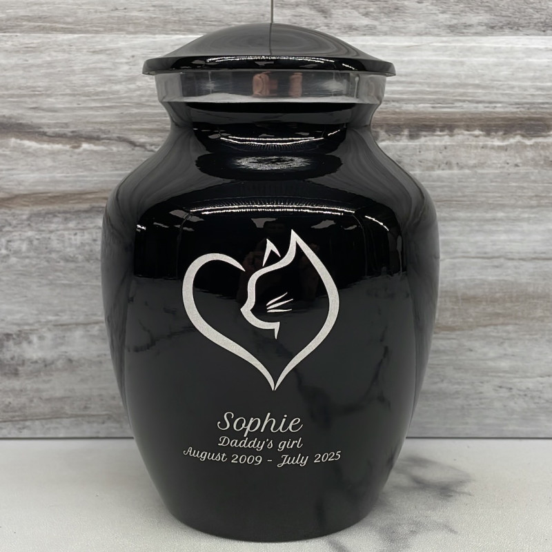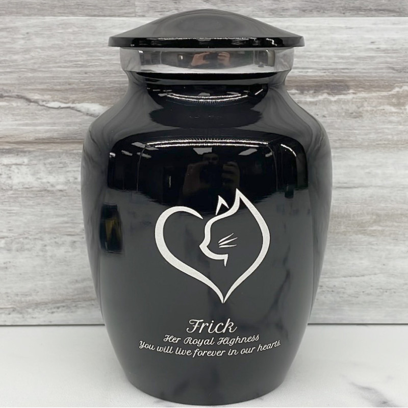 The Small Jet Black Loving Cat Sharing Urn Pet Cremation Urn is an attractive and meaningful way to pay tribute to your pet who has passed on. Optional engraving features a name line and two additional lines that can include dates or sentiment lines. Choose from our most popular sentiments, customize them or enter your own text to make it completely unique.