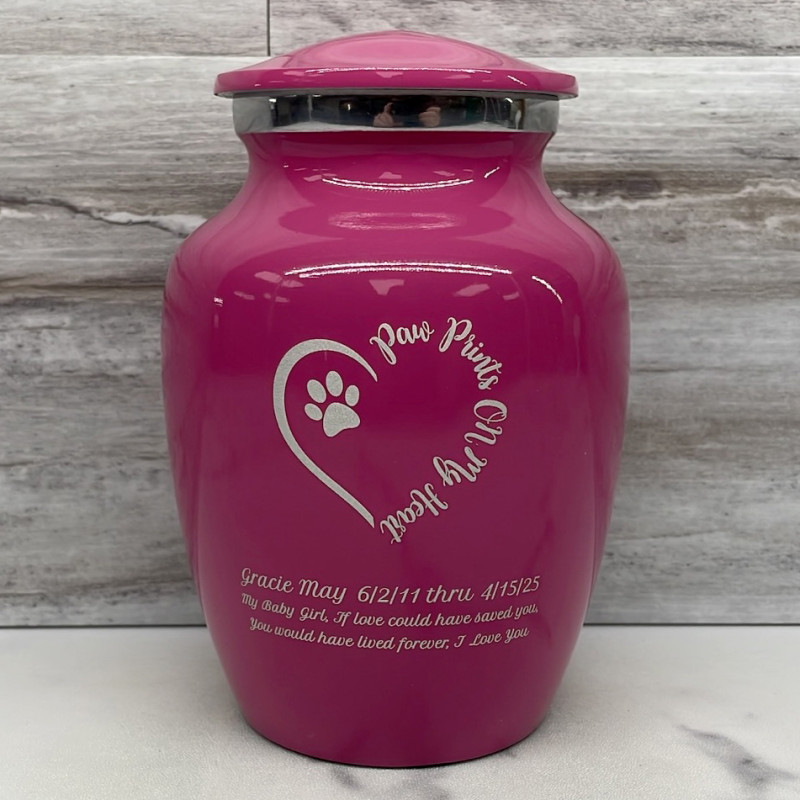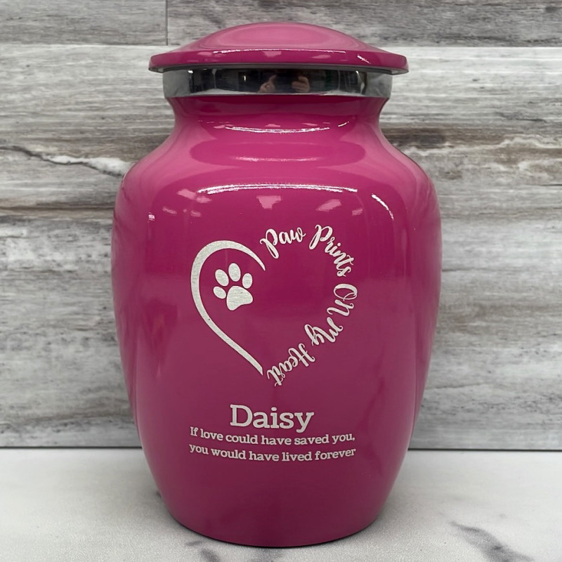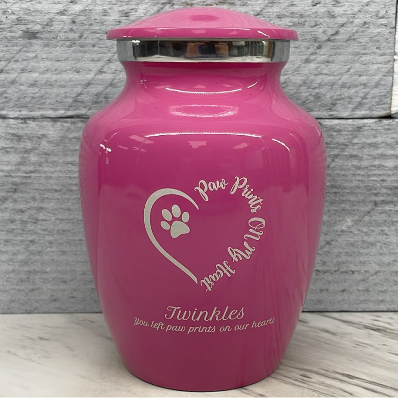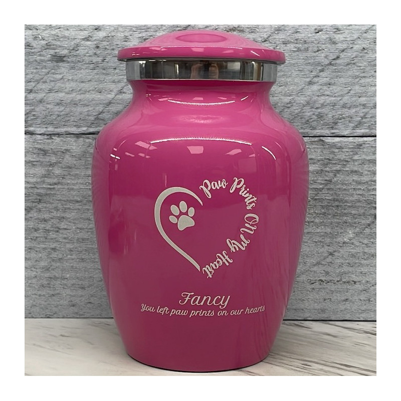 The Small Rose Pink Paw Prints On My Heart Sharing Urn Pet Cremation Urn is an attractive and meaningful way to pay tribute to your pet who has passed on. Optional engraving features a name line and two additional lines that can include dates or sentiment lines. Choose from our most popular sentiments, customize them or enter your own text to make it completely unique.