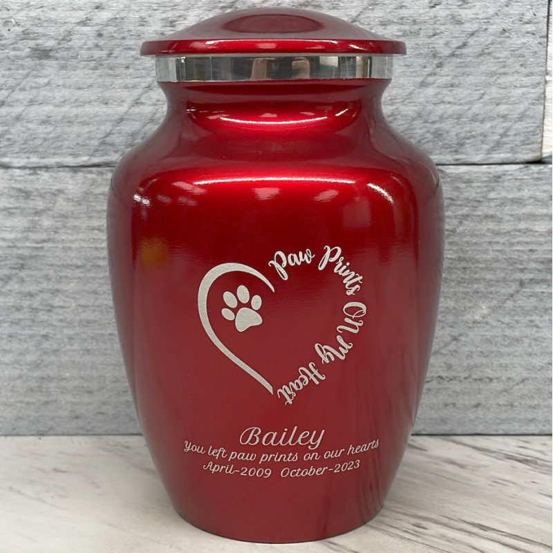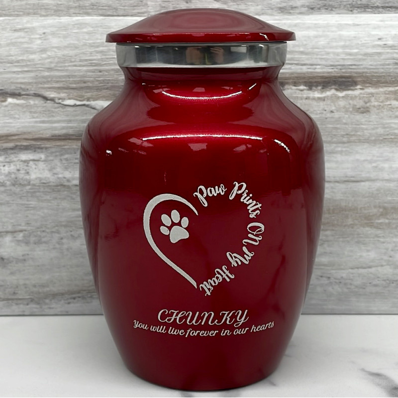 Small Paw Prints On My Heart Pet Cremation Urn - Ruby Red
