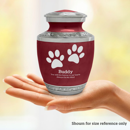 The Small Paw Prints Pet Cremation Urn - Rose Red is an attractive and meaningful way to pay tribute to your pet who has passed on. Optional engraving features a name line and two additional lines that can include dates or sentiment lines. Choose from our most popular sentiments, customize them or enter your own text to make it completely unique.