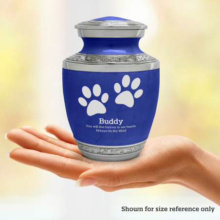 The Small Paw Prints Pet Cremation Urn - Royal Blue is an attractive and meaningful way to pay tribute to your pet who has passed on. Optional engraving features a name line and two additional lines that can include dates or sentiment lines. Choose from our most popular sentiments, customize them or enter your own text to make it completely unique.