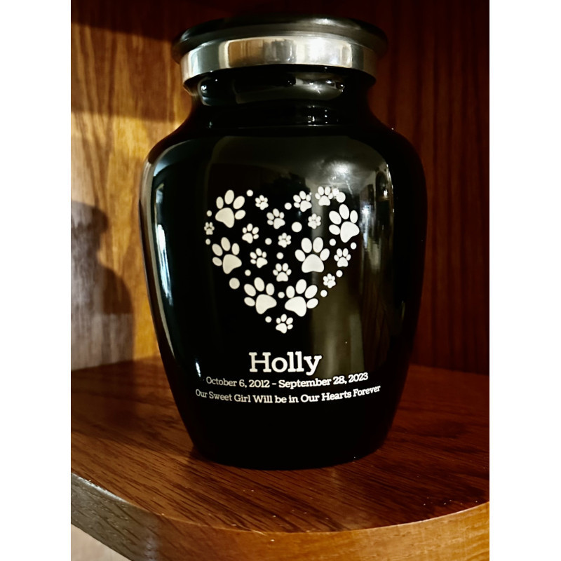 Each of these Pawprint Heart Cremation Urns are made custom when you order it. It would be our honor to create a meaningful resting place for your companion.