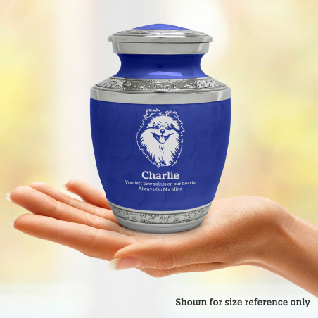 The Small Pomeranian Pet Cremation Urn - Royal Blue is an attractive and meaningful way to pay tribute to your pet who has passed on. Optional engraving features a name line and two additional lines that can include dates or sentiment lines. Choose from our most popular sentiments, customize them or enter your own text to make it completely unique.