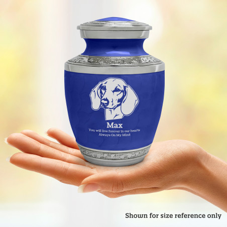 The Small Shorthaired Daschund Pet Cremation Urn - Royal Blue is an attractive and meaningful way to pay tribute to your pet who has passed on. Optional engraving features a name line and two additional lines that can include dates or sentiment lines. Choose from our most popular sentiments, customize them or enter your own text to make it completely unique.