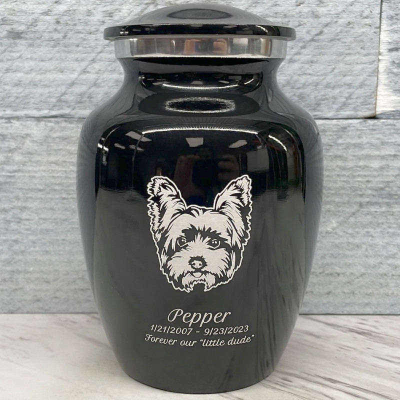 The Small Jet Black Yorkshier Terrier Sharing Urn Pet Cremation Urn is an attractive and meaningful way to pay tribute to your pet who has passed on. Optional engraving features a name line and two additional lines that can include dates or sentiment lines. Choose from our most popular sentiments, customize them or enter your own text to make it completely unique.