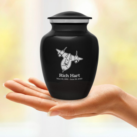 Select a SR71 Blackbird Jet Sharing Urn to create a personal memorial that is a step larger than a keepsake urn but more petite than a full size urn. Bold, attractive colors offer sharp contrast with the engraved text and detailed artwork.
