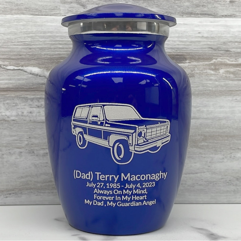 Select an engraved sharing urn to create a personal memorial that is a step larger than a keepsake urn but more petite than a full size urn. Bold, attractive colors offer sharp contrast with the engraved text and detailed artwork.