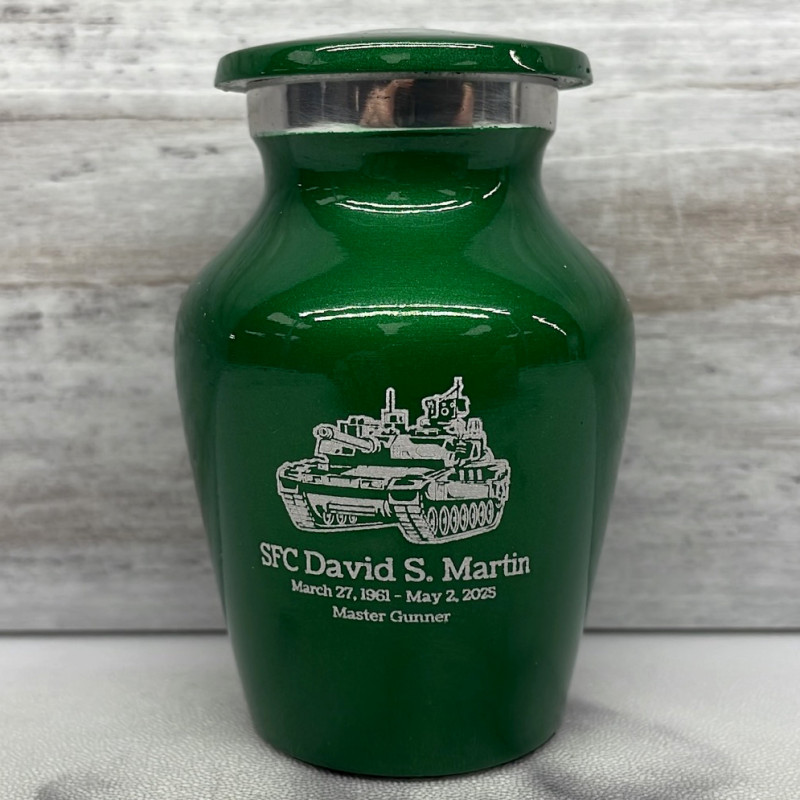 Choose a Tank Cremation Urn to create a beautiful memorial that is sized to hold the entire remains of any adult. Bold, attractive colors offer sharp contrast with the engraved text and detailed artwork.
