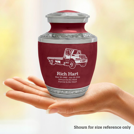 Select Tow Truck Sharing Urn - Rose Red to create a personal memorial that is a step larger than a keepsake urn but more petite than a full size urn. Bold, attractive colors offer sharp contrast with the engraved text and detailed artwork.