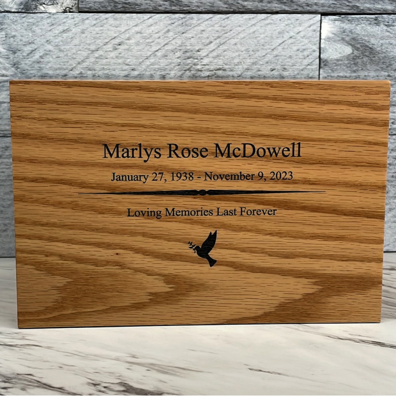 The warm and rich appearance of this oak urn make it a fitting resting place for any loved one. Engineered oak provides an excellent blend of quality and affordability. Hand constructed and finished in a workshop in Iowa, this quality cremation urn fits in with any decor.