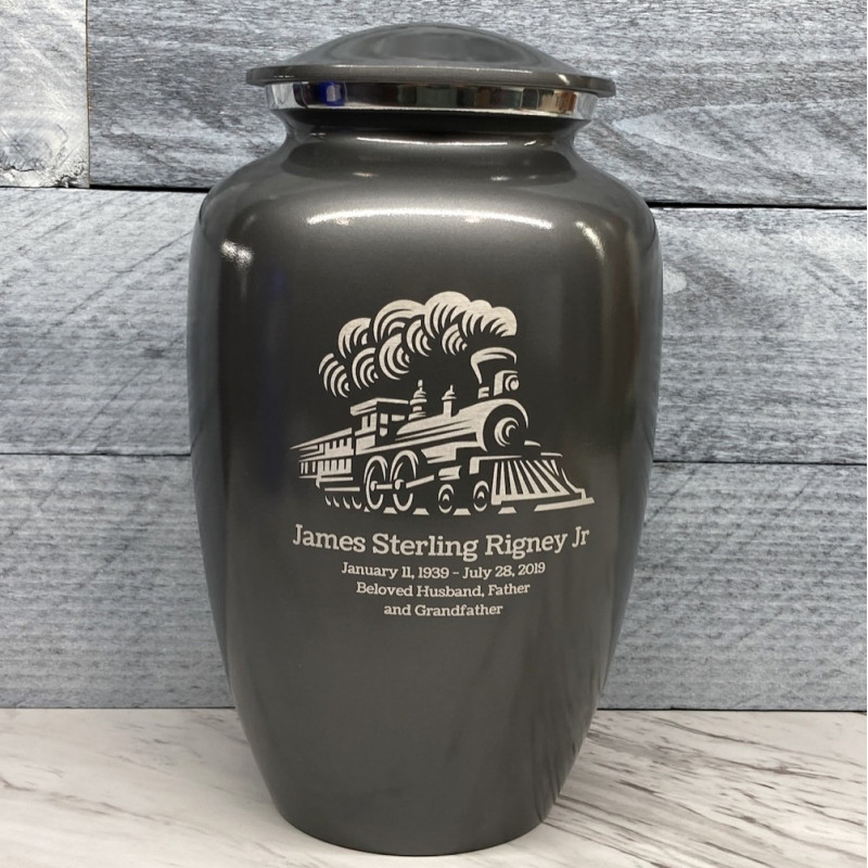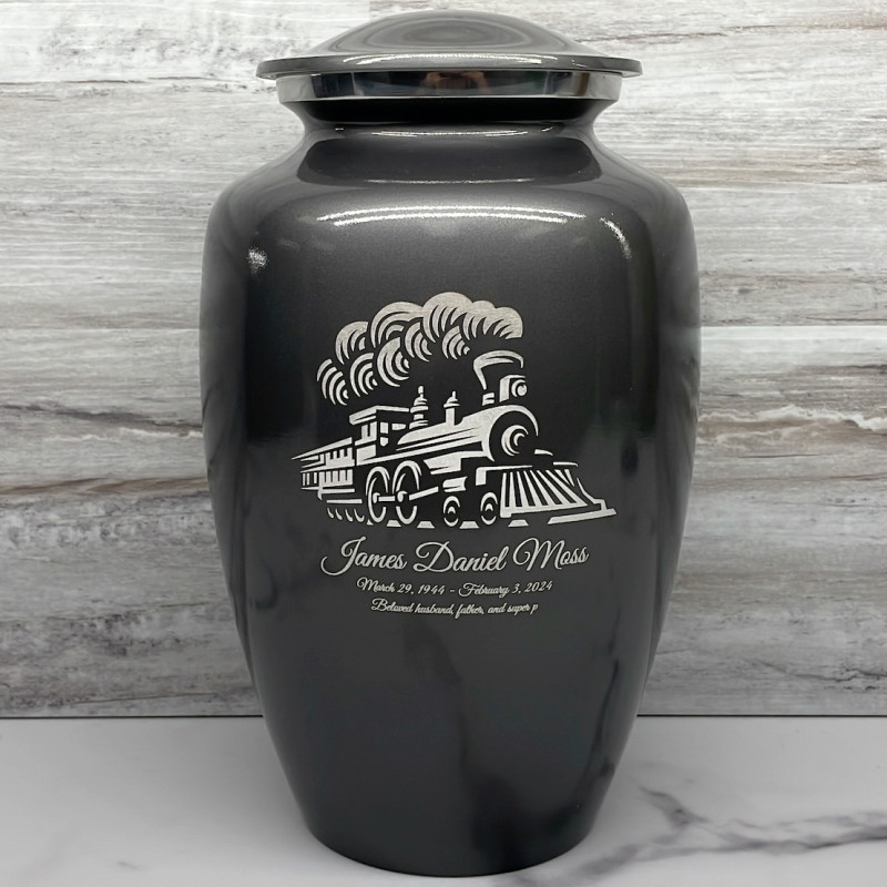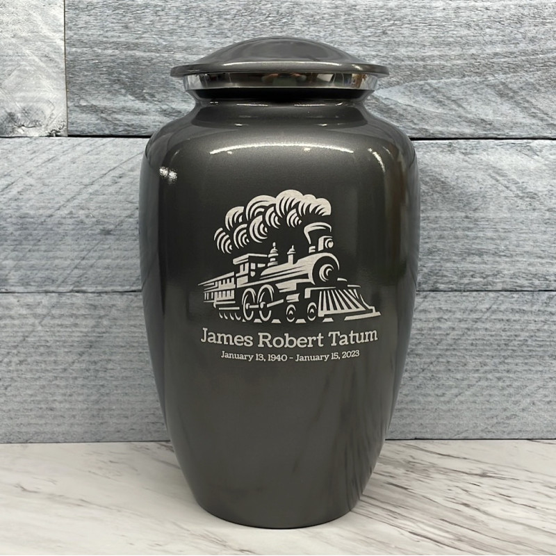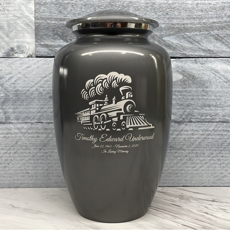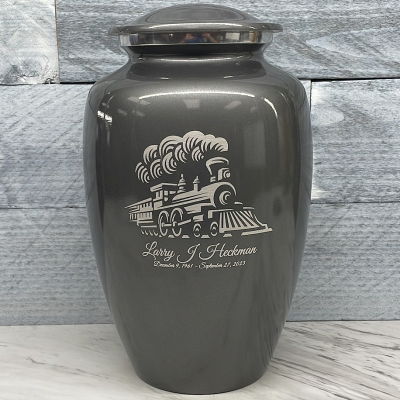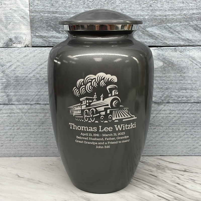 Celebrate a loved ones passion for locomotives by creating a custom Gunmetal Gray Train Cremation Urn for their eternal resting place. The attractive train engine artwork long with optional engraving that includes a name line, date line and three lines for sentiments allows for the creation of completely custom memorial crafter to stand the test of time.