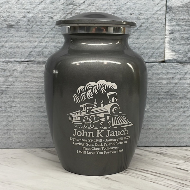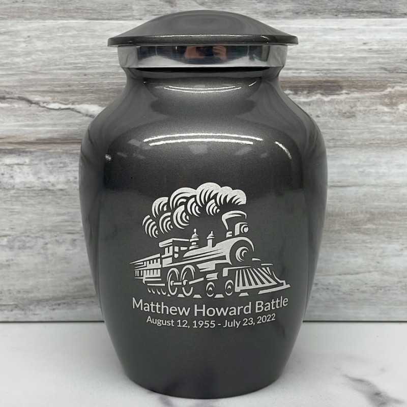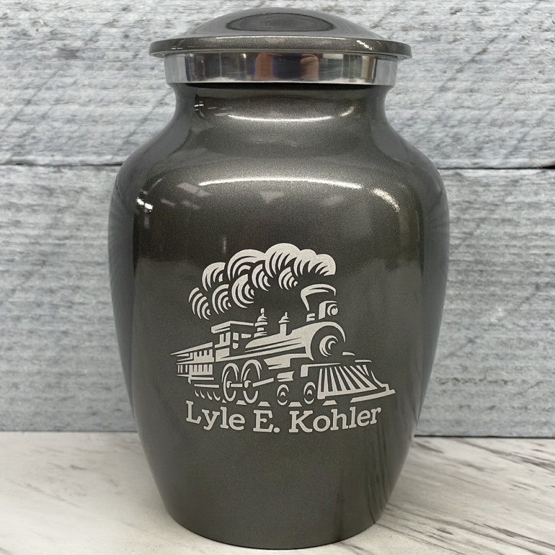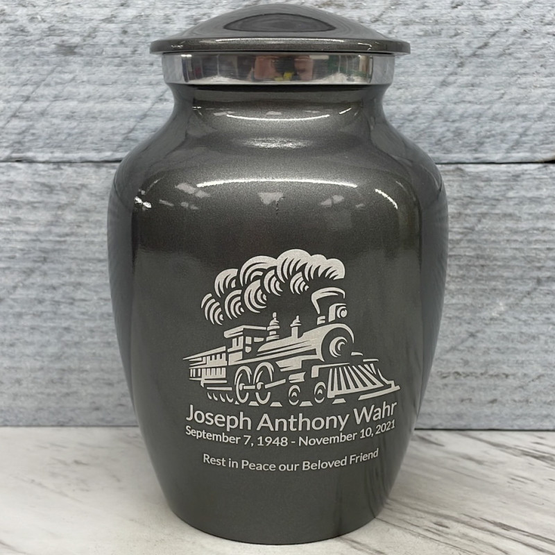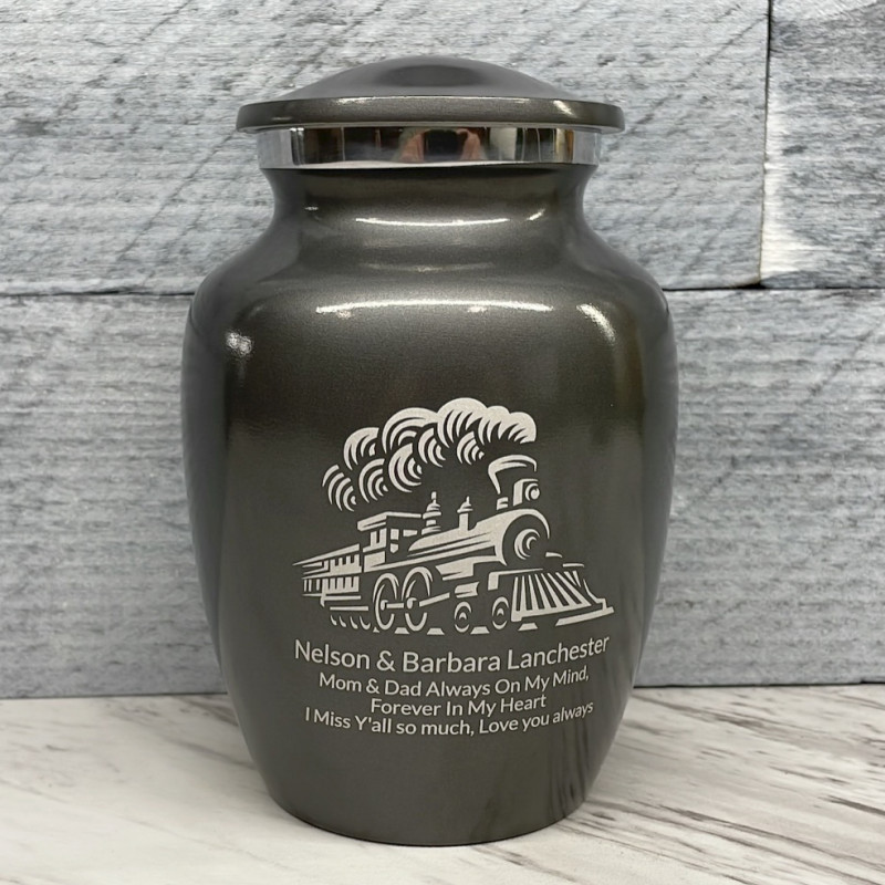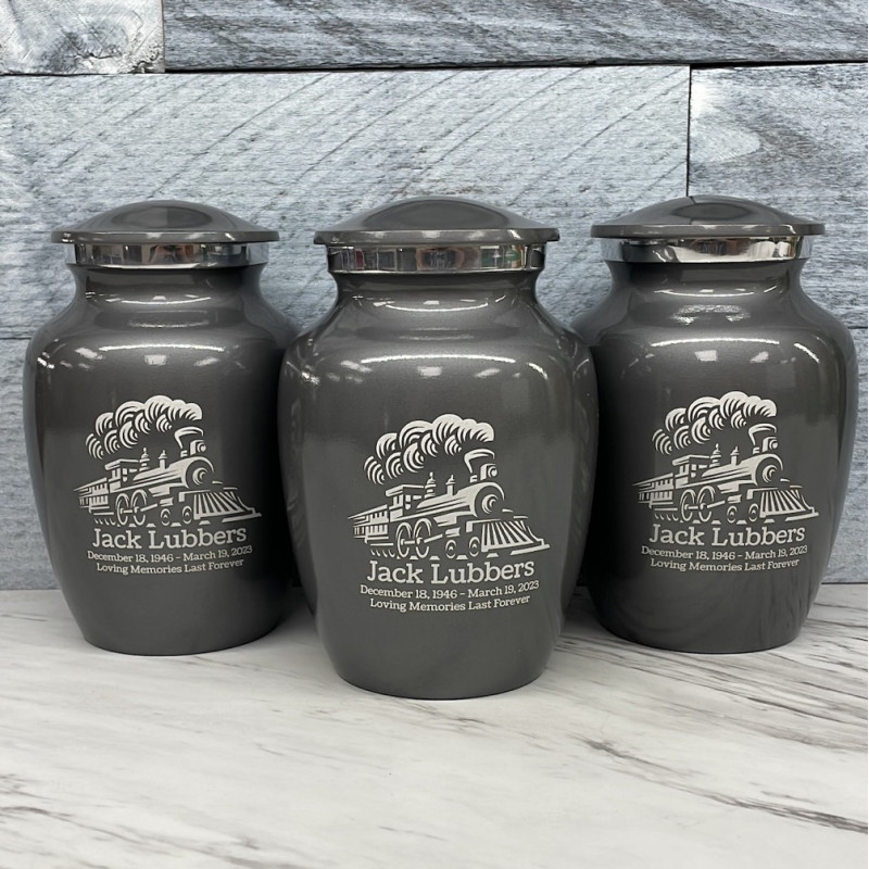 Remember the adventurous spirit of your loved one with the Gunmetal Gray Train Sharing Cremation urn. It's an outstanding value that allows everyone in the family to have a memorial of their own engraved with a detailed locomotive. With optional engraving front and back it can be made unique to your loved one. A threaded lid and felt base ensure it securely closes and protects display surfaces.