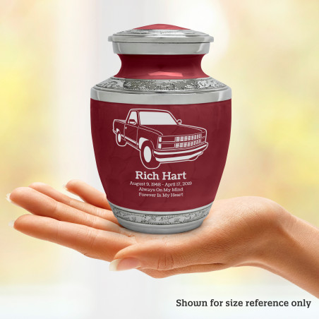Select Truck V Sharing Urn - Rose Red to create a personal memorial that is a step larger than a keepsake urn but more petite than a full size urn. Bold, attractive colors offer sharp contrast with the engraved text and detailed artwork.