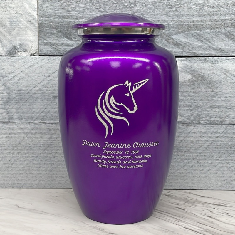 The Purple Luster Unicorn Cremation Urn is engraved with a unicorn that is both whimsical and powerful. The attractive unicorn artwork long with optional engraving that includes a name line, date line and three lines for sentiments allows for the creation of completely custom memorial crafter to stand the test of time.