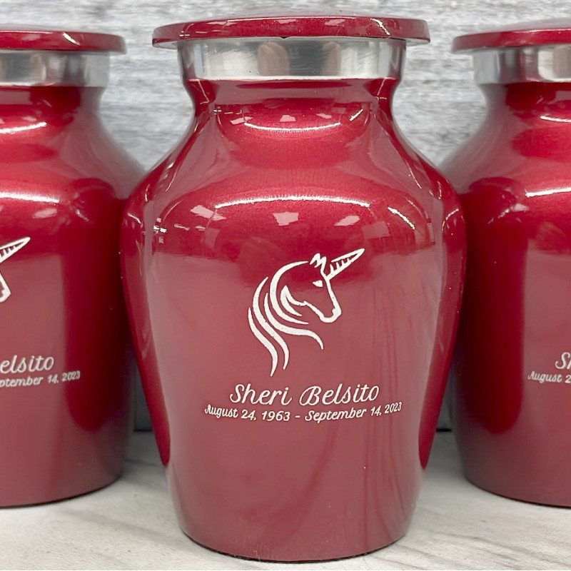 The Ruby Red Unicorn Keepsake Cremation Urn is an attractive and fitting personal memorial for a loved one who also loved the magic and mystery of unicorns. The Ruby Red color combined with an attractive engraved unicorn artwork and optional custom engraving creates an unique keepsake for family members and close friends that can be treasured for years to come.