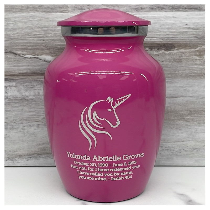 Select an Unicorn Sharing Urn to create a personal memorial that is a step larger than a keepsake urn but more petite than a full size urn. Bold, attractive colors offer sharp contrast with the engraved text and detailed artwork.