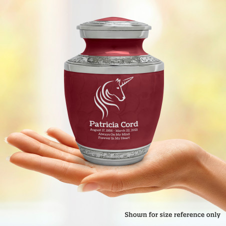 Select Unicorn Sharing Urn - Rose Red to create a personal memorial that is a step larger than a keepsake urn but more petite than a full size urn. Bold, attractive colors offer sharp contrast with the engraved text and detailed artwork.