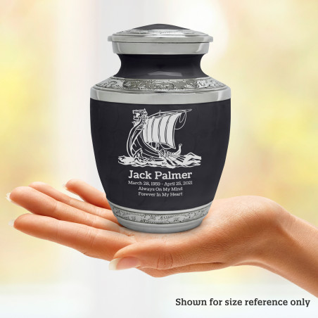 Select Viking Ship Sharing Urn - Ebony Black to create a personal memorial that is a step larger than a keepsake urn but more petite than a full size urn. Bold, attractive colors offer sharp contrast with the engraved text and detailed artwork.