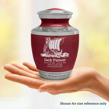 Select Viking Ship Sharing Urn - Rose Red to create a personal memorial that is a step larger than a keepsake urn but more petite than a full size urn. Bold, attractive colors offer sharp contrast with the engraved text and detailed artwork.