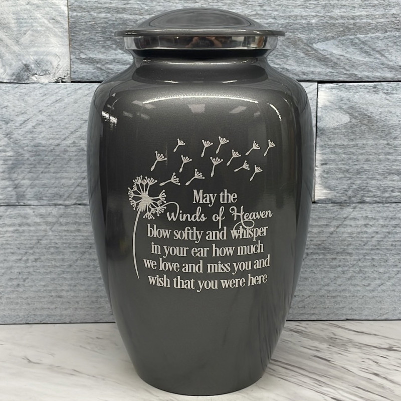 Choose a Winds of Heaven Cremation Urn to create a beautiful memorial that is sized to hold the entire remains of any adult. Bold, attractive colors offer sharp contrast with the engraved text and detailed artwork. The dandelion is a beautiful metaphor for a life and the persistence of memories of your loved one.