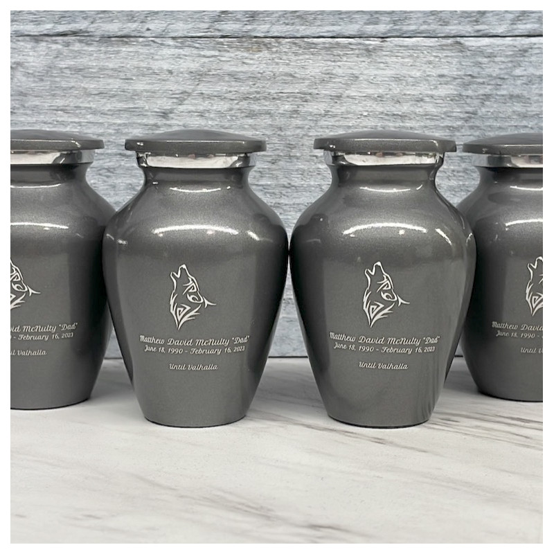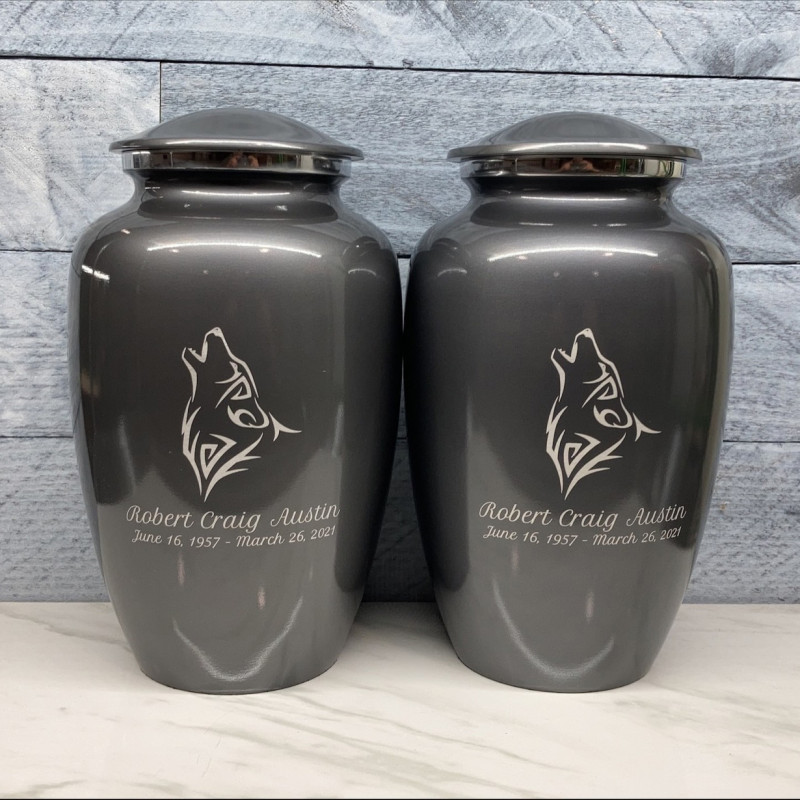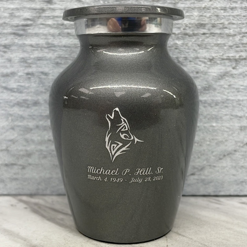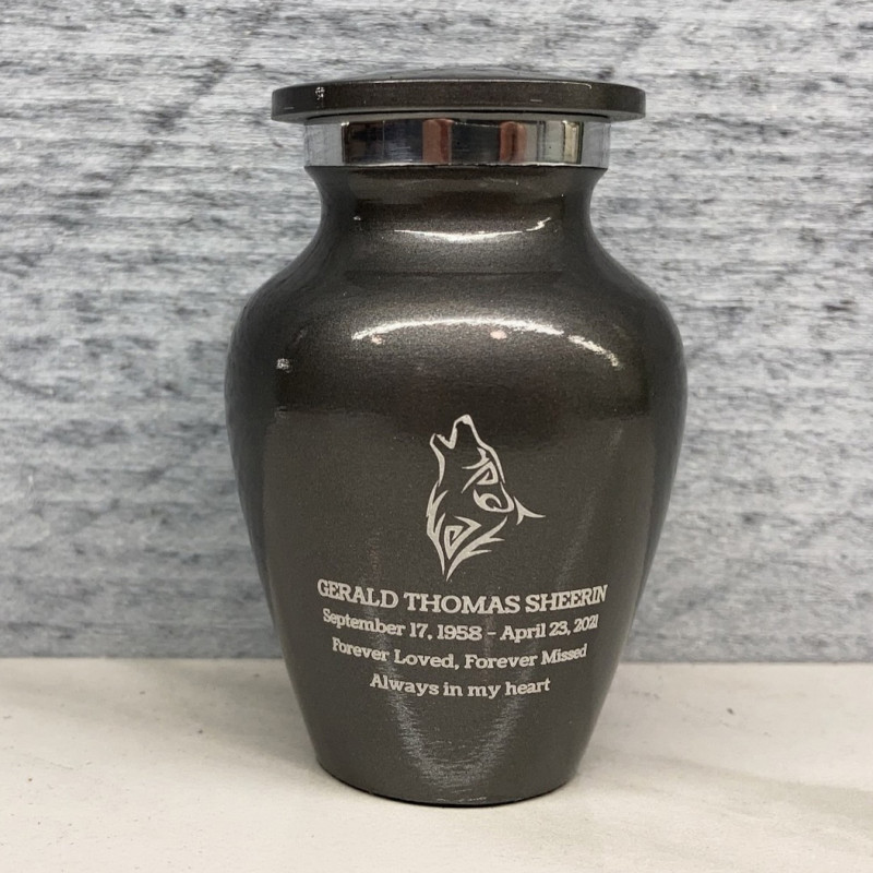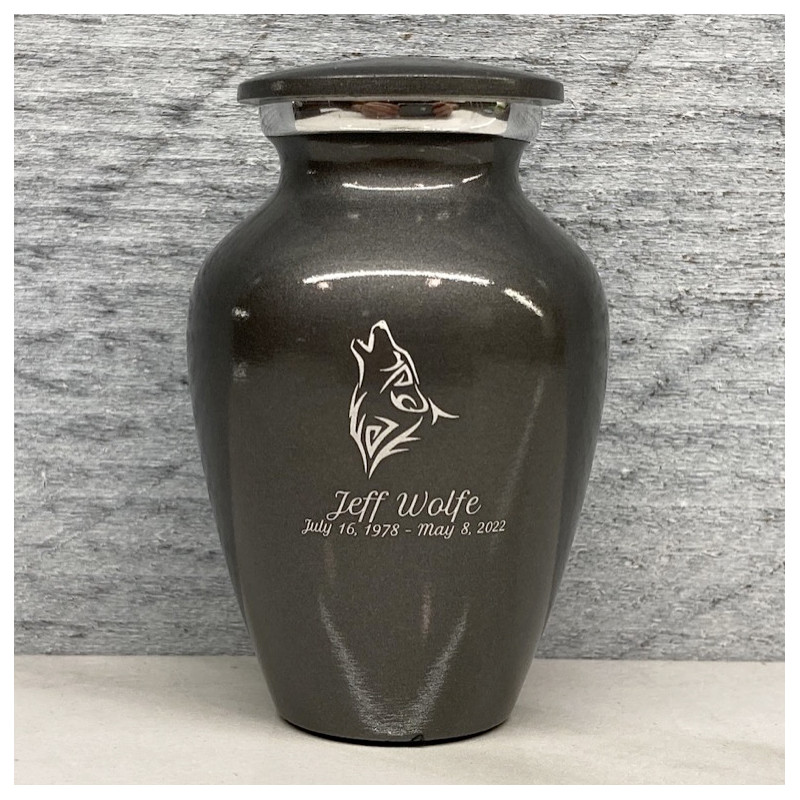 Choose the Gunmetal Wolf Keepsake Cremation Urn to memorialize your loved one with an attractive and powerful wolf artwork engraved keepsake. Customize the urn with special engraving for each family member or close friend, creating memorials for each to hold close.