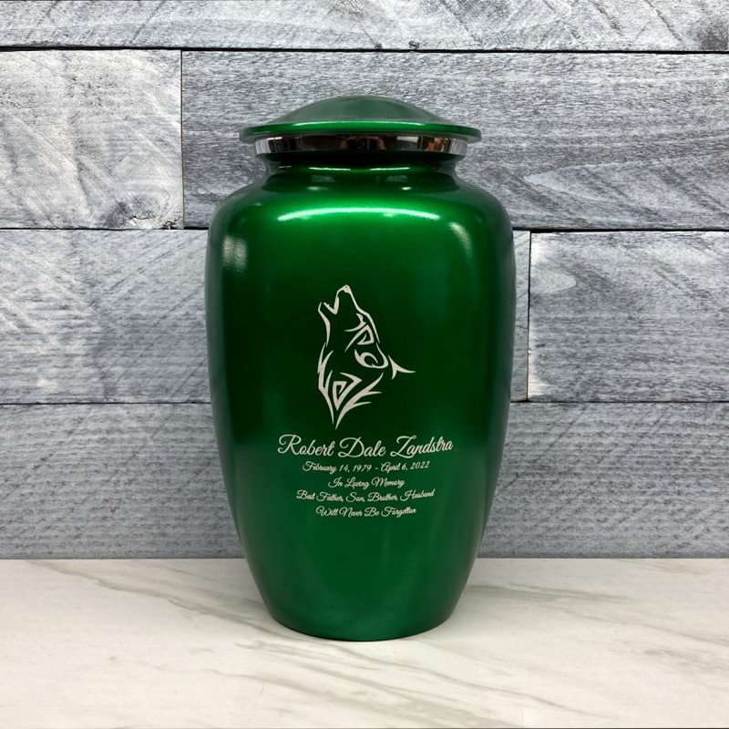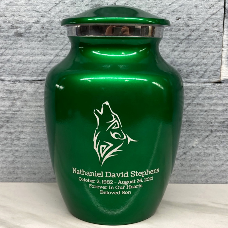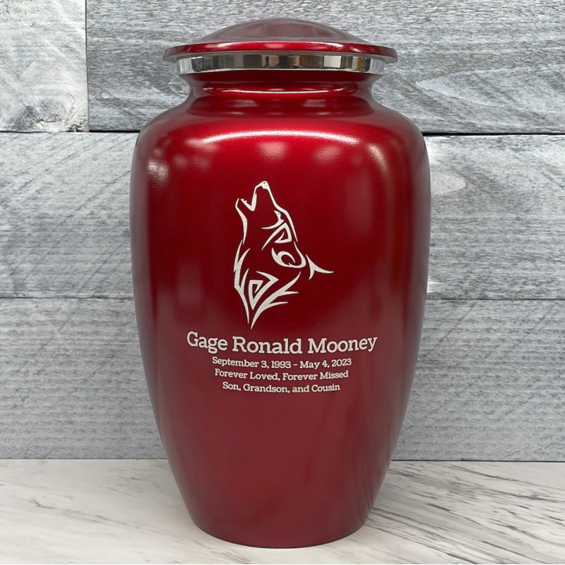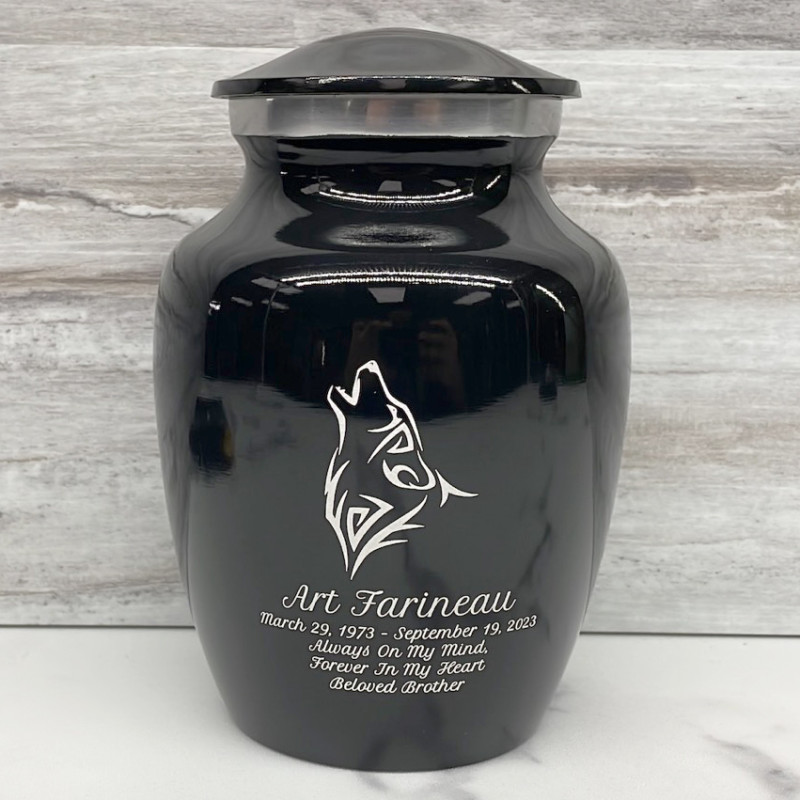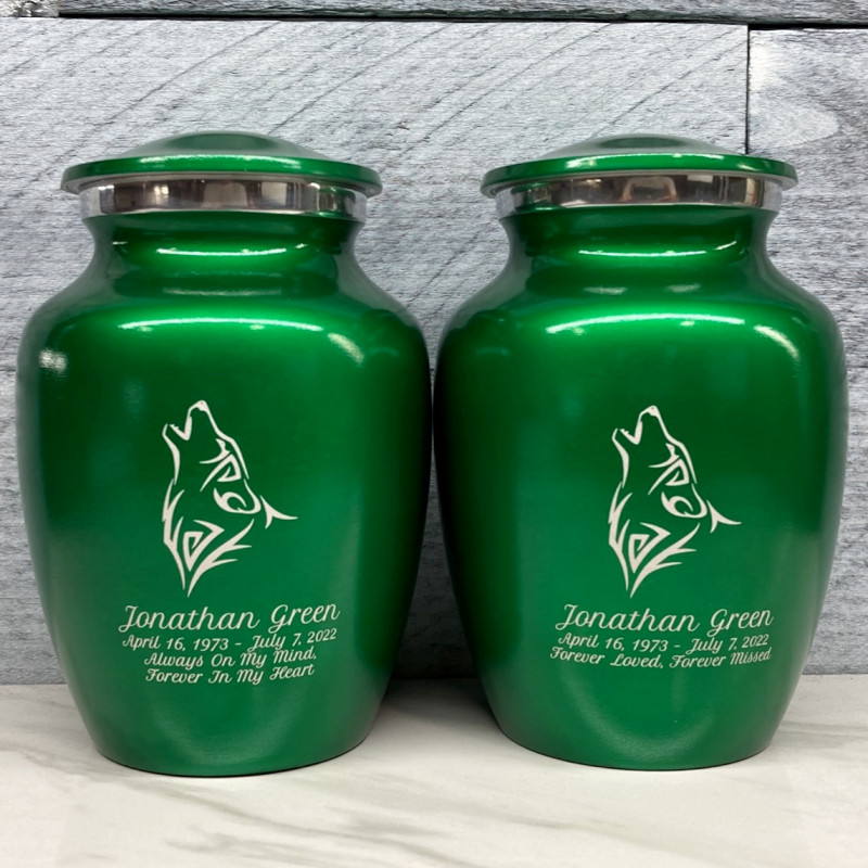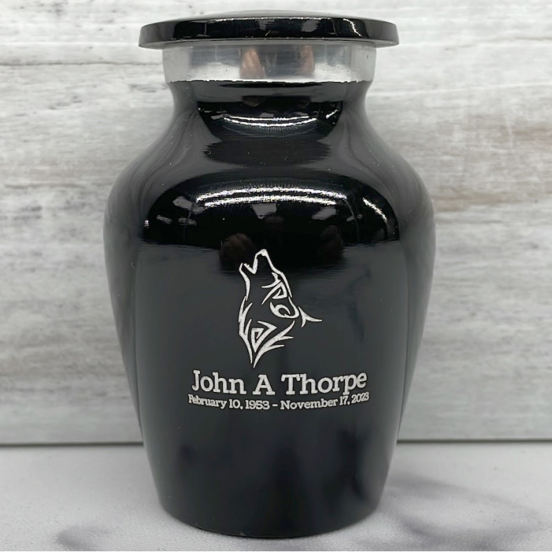 Choose the Gunmetal Wolf Keepsake Cremation Urn to memorialize your loved one with an attractive and powerful wolf artwork engraved keepsake. Customize the urn with special engraving for each family member or close friend, creating memorials for each to hold close.