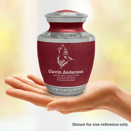 Select Wolf Sharing Urn - Rose Red to create a personal memorial that is a step larger than a keepsake urn but more petite than a full size urn. Bold, attractive colors offer sharp contrast with the engraved text and detailed artwork.