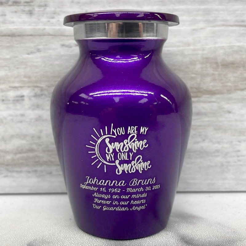 Choose a You Are My Sunshine Keepsake Urn to create an intimate and personal memorial for family members or close friends. Bold, attractive colors offer sharp contrast with the engraved text and artwork.