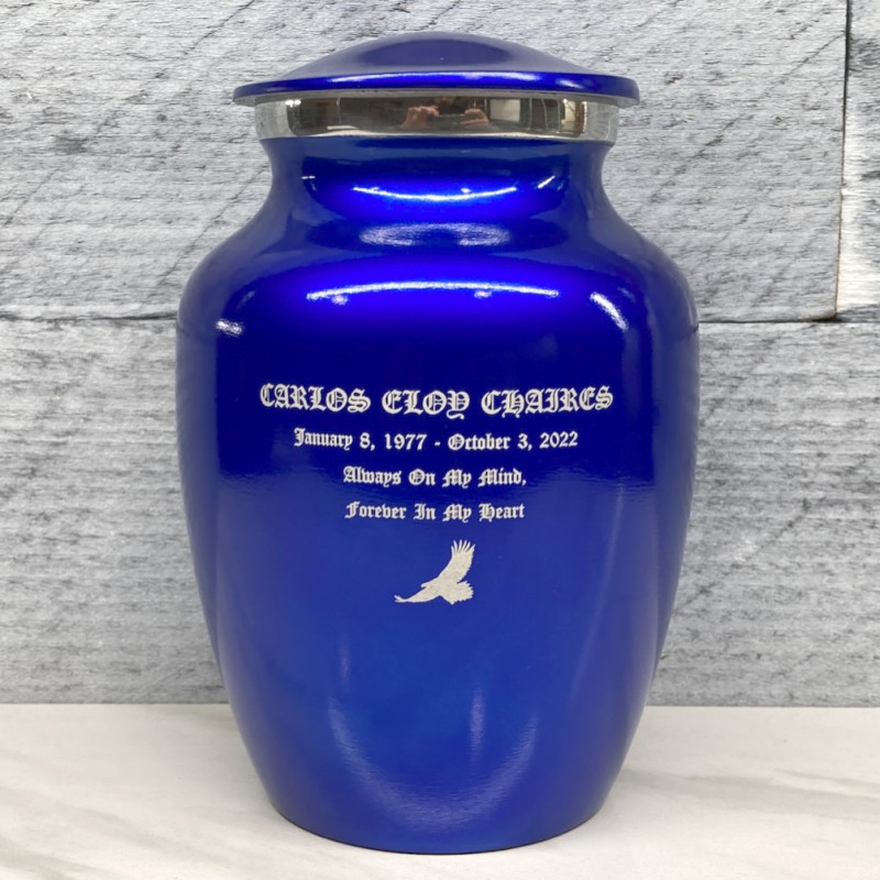 Select an engraved sharing urn to create a personal memorial that is a step larger than a keepsake urn but more petite than a full size urn. Bold, attractive colors offer sharp contrast with the engraved text and detailed artwork.
